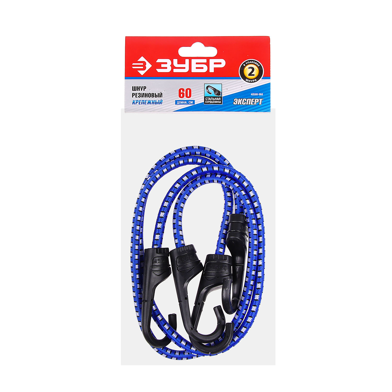 Шнур крепежный резиновый 60 см,d8мм, 2 шт, крюки пласт. сердечник сталь(арт.40508-060) ЗУБР *1/6/48