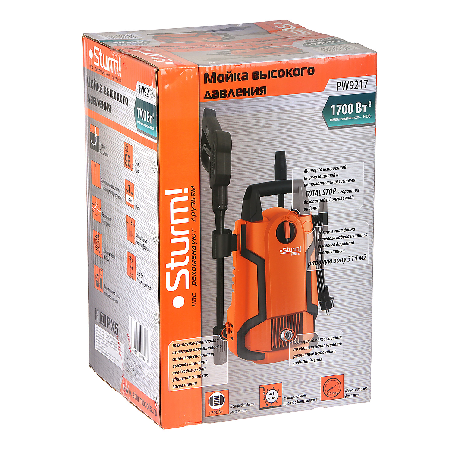 • Увеличенная до 5 метров длина сетевого кабеля и шланга высокого давления, до 5 метров, обеспечивает расширение рабочей зоны до 314 квадратных метров.