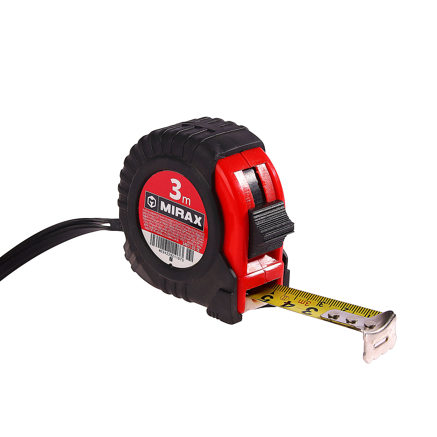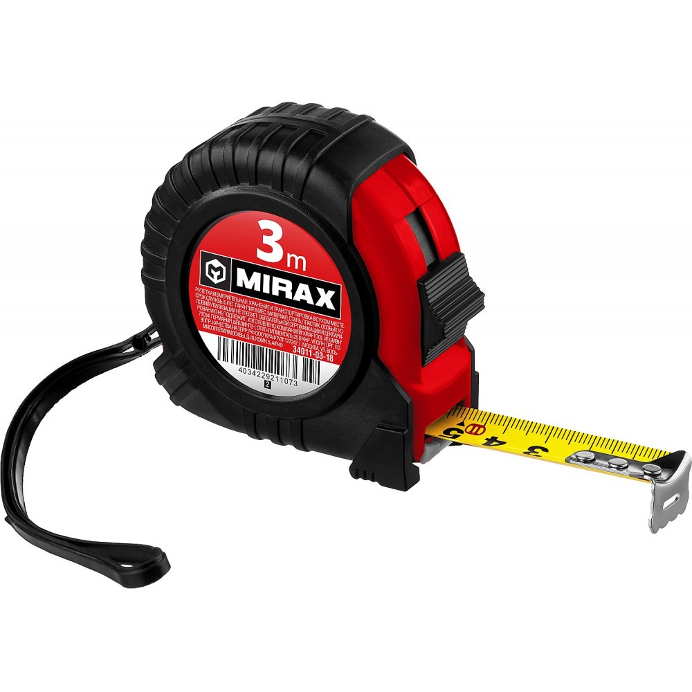 3-метровая рулетка MIRAX – незаменимый помощник для измерения расстояния и длины при проведении ремонтных и строительных работ. Точная разметка на стальном полотне, сдвижной фиксатор, надежный зацеп на конце ленты обеспечивают безошибочность измерений. Удобству использования способствует быстрый возвратный механизм и эргономичный прорезиненный корпус. Лента отличается устойчивостью к заломам. Конструкцией рулетки предусмотрен шнур для запястья и надежное крепление на ремень.