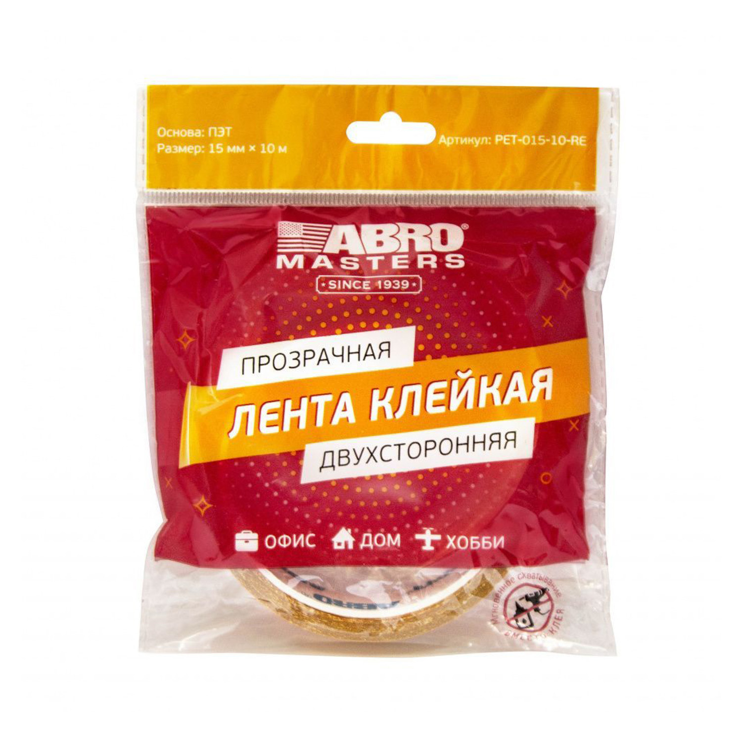 Лента клейкая двусторонняя на ПЭТ основе Прозрачная 15мм х10м PET-015-10-RE "ABRO" *1/575