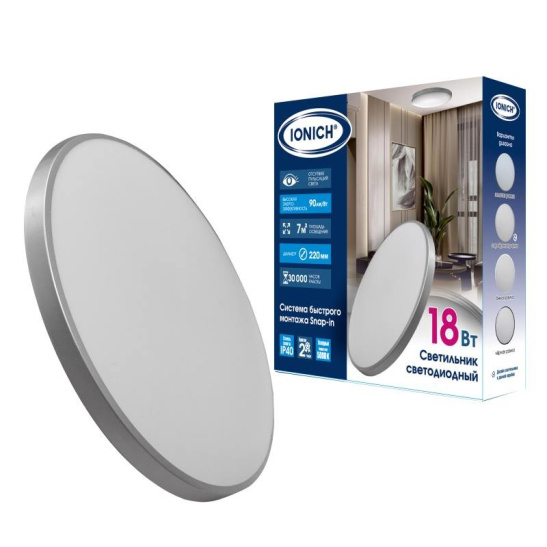 Светильник светодиодный акриловый 220мм IONICH "Snap In"18Вт 5000К 1620Лм IP40 серебро S=7м2 2697*1/20