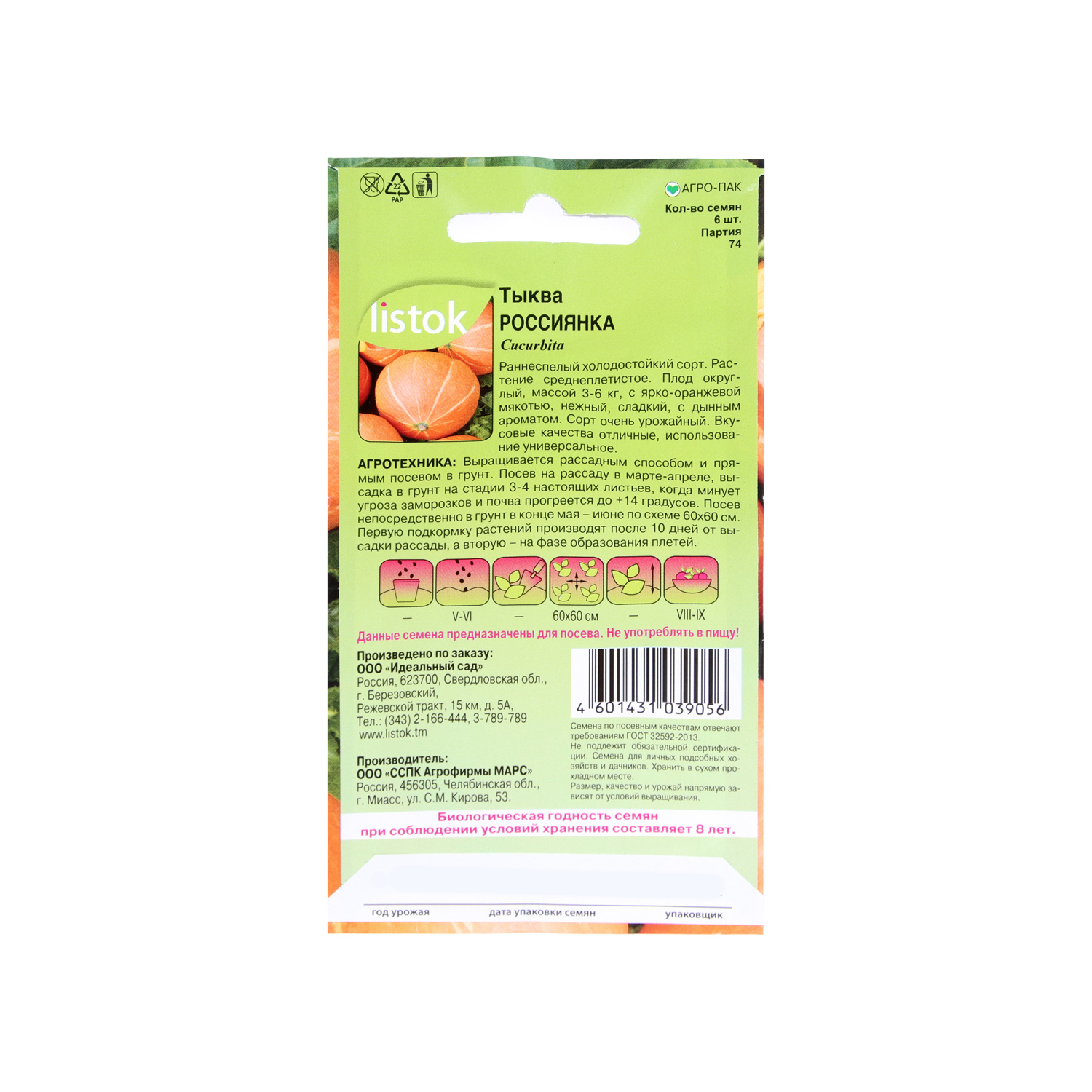 Семена Тыква Россиянка 6шт/2гр LISTOK *10/500