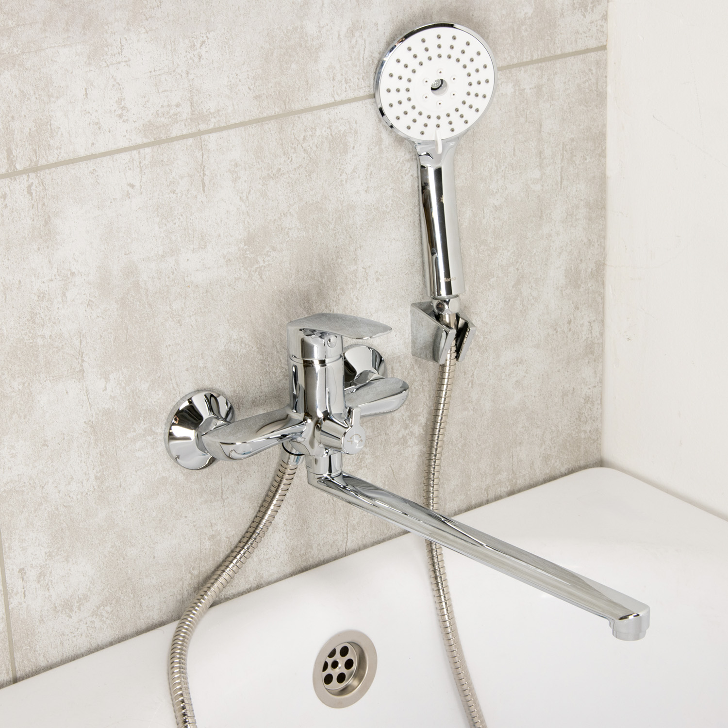 Смеситель, прокладки с фильтром - 2 шт., отражатели - 2 шт., эксцентрики - 2 шт., лейка душевая, шланг, держатель лейки с креплением, инструкция