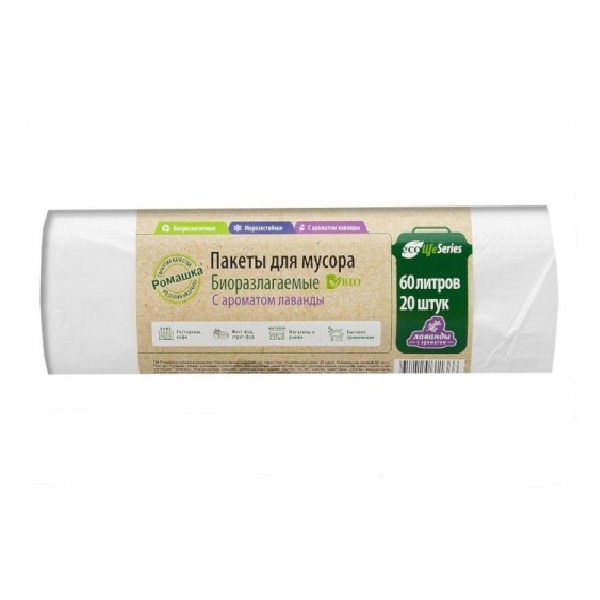 Мешки для мусора 60л*20шт толщ.6мкм Биоразлагаемые Белый ПНД арт.ЭЛБ602040Б "Ромашка" *40